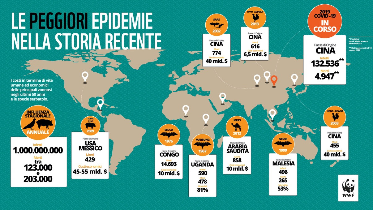 Esiste un legame strettissimo tra le malattie che stanno terrorizzando il Pianeta e le dimensioni epocali della perdita di natura. Virus, batteri e altri microrganismi nella maggior parte dei casi sono innocui, anzi, spesso essenziali per gli ecosistemi e l’uomo. Tuttavia, alcuni di essi, come il coronavirus SARS-COV-2 all’origine del Covid-19, possono provocare impatti estremamente negativi sulla salute umana, sui sistemi sociali ed economici, come quelli a cui stiamo assistendo nell’attuale emergenza sanitaria che ha raggiunto la portata di una vera e propria pandemia, avendo già colpito oltre 129 paesi in ogni continente con oltre 5.000 vittime. Quella provocata dal Coronavirus fa parte delle cosiddette “malattie emergenti” – come ad esempio Ebola, AIDS, SARS, influenza aviaria o suina – che non sono catastrofi del tutto casuali ma mostrano numerosi elementi comuni. Spesso infatti le zoonosi, ovvero le malattie trasmesse dagli animali all’uomo (esattamente come il Covid-19), sono conseguenza di nostri comportamenti errati tra cui il commercio illegale o non controllato di specie selvatiche e, più in generale, l’impatto dell’uomo sugli ecosistemi naturali.